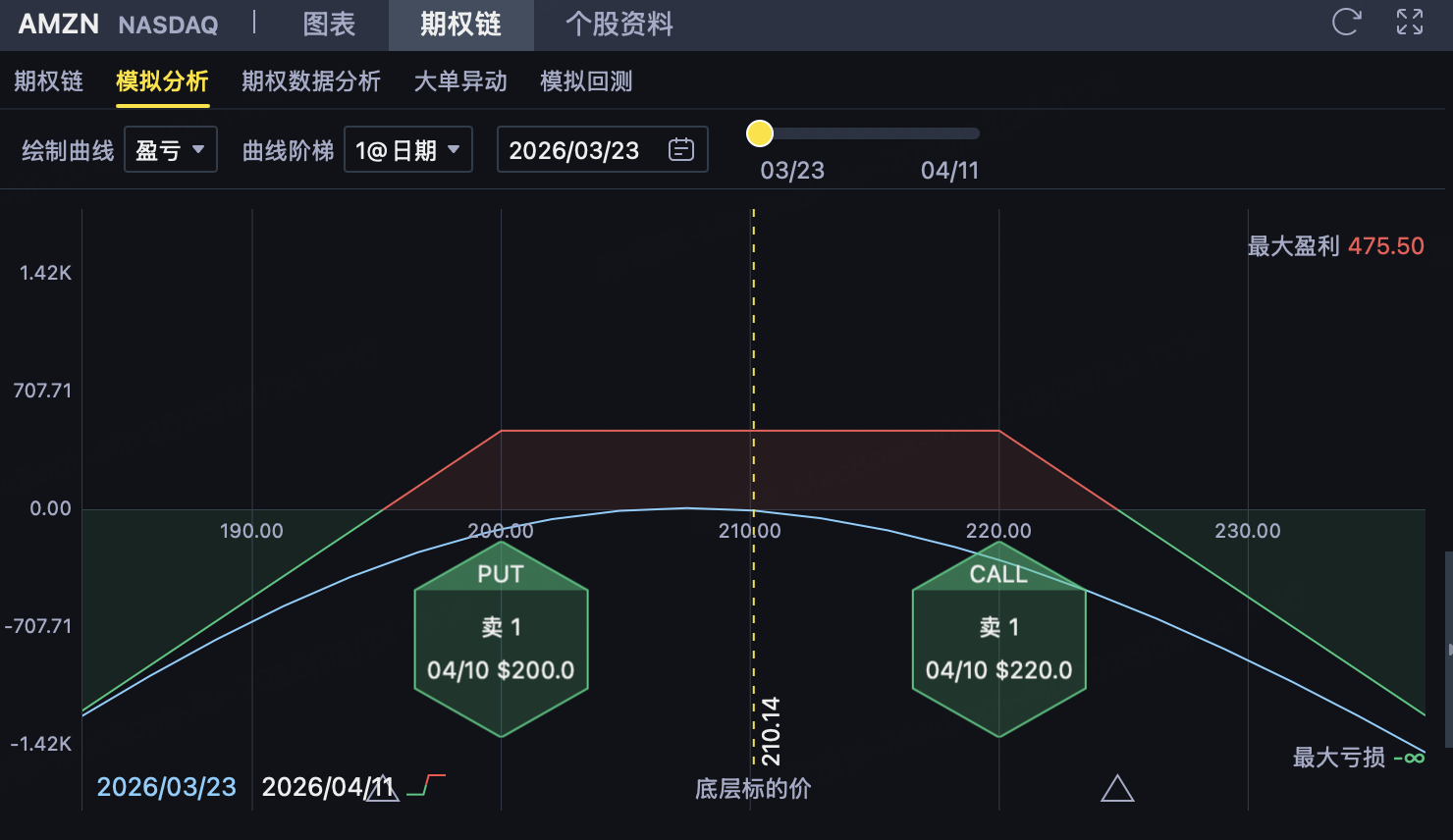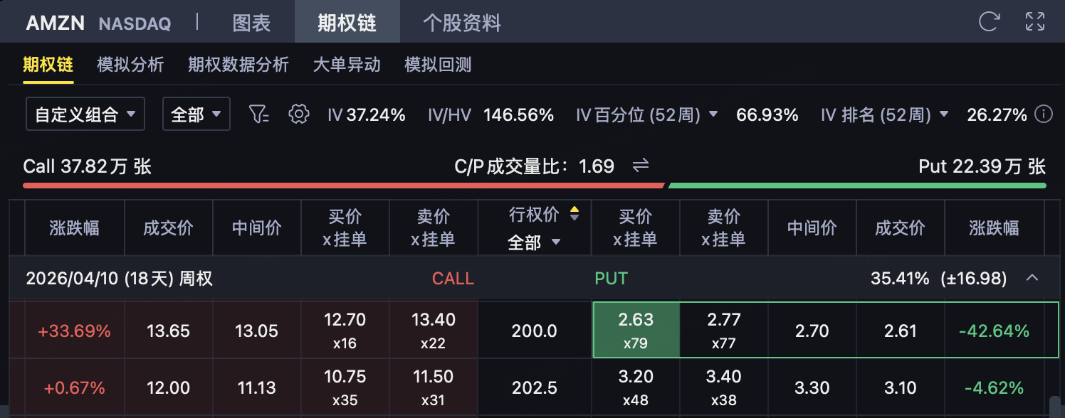这条Put腿用于博取AMZN在到期前能够守住200美元附近支撑。只要到期价格≥200美元,这份Put失效,投资者可保留对应权利金。
