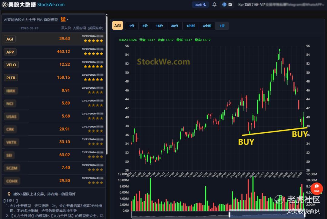 周一用StockWe.com 的AI自动筛选出来当天最值得Buy的,排在榜首的是 黄金公司 $Alamos Gold Inc(AGI)$ ,日线已经从52周新高回调到双底支撑,难怪今天反弹。追上了一波今天。