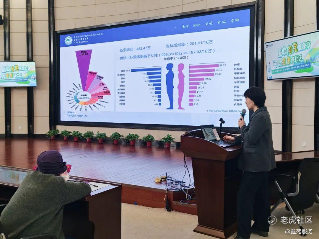 健康管理中心护士长郭俐君接着讲解了《城市癌症早诊早治项目》——这是国家重大公共卫生服务项目,45—74岁的郑州常住居民,现场填写问卷,就有机会获得肺癌、乳腺癌、肝癌、结直肠癌、上消化道癌的免费筛查。