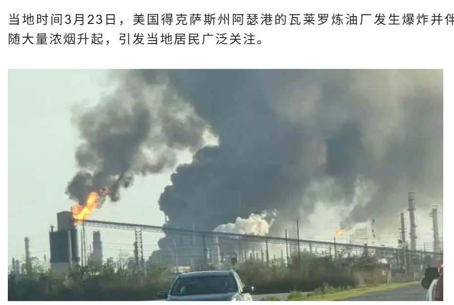 紧接着,市场又传来了伊朗能源设施再遭美以联军轰炸的消息,而同时,美国本土十大炼油厂之一的瓦莱罗炼油厂也突发大爆炸,现场冒出大量浓烟,直接冲击了WTI原油的走势。