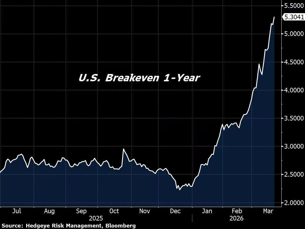 在通胀端,假设能源上涨带来0.25个百分点的影响,年底的核心PCE通胀预测已被微调至2.5%。1年期的平准通胀率(预期指标)已经出现了大幅攀升: