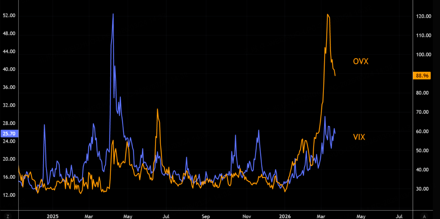 在原油如此巨大的波动中,其隐含波动率(IV)一直维持在高位: