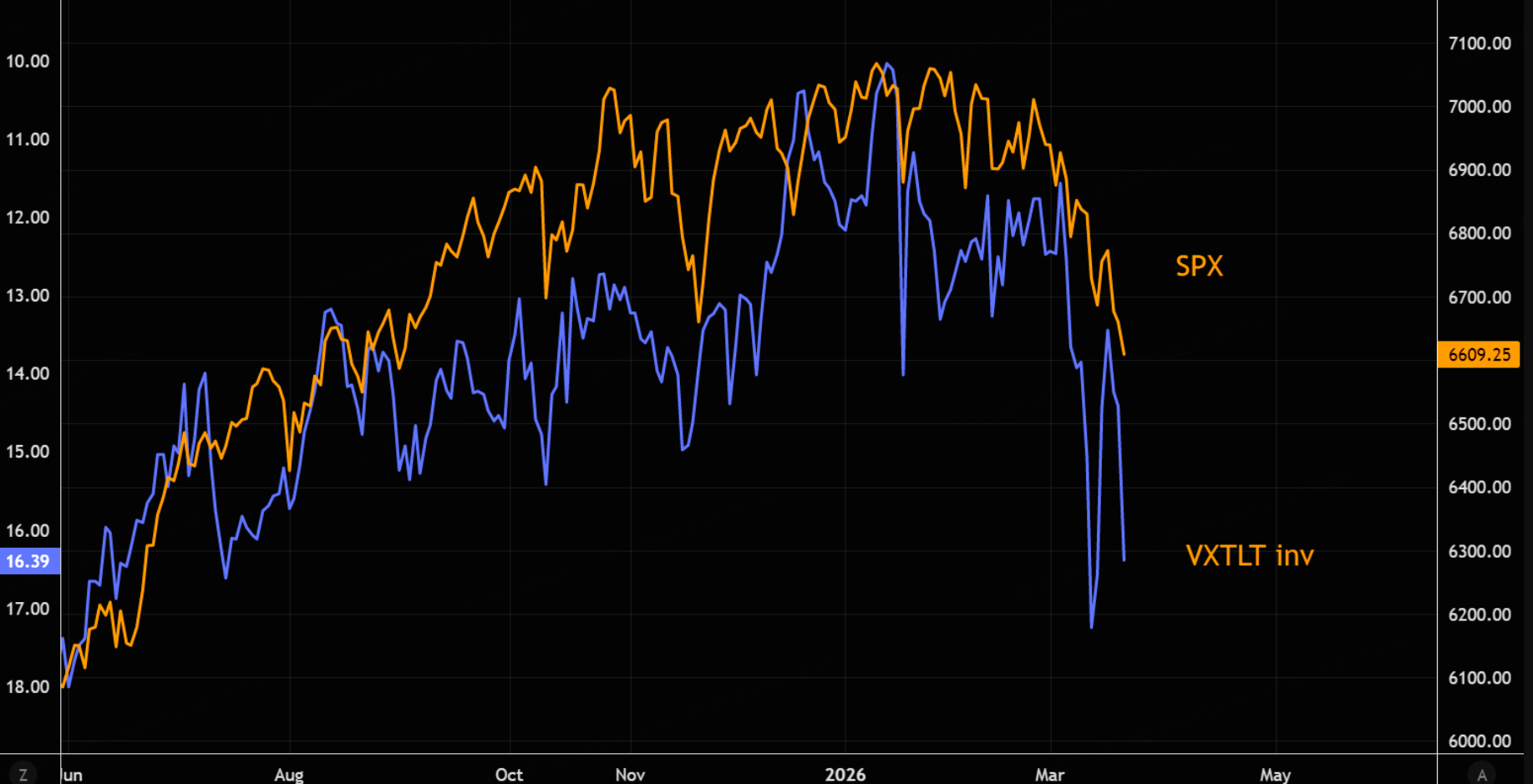 在利率飙升的压力下,标普500指数显得极度脆弱。标普500指数显然无法忍受债券波动性短期的持续上升。来看这个明显的负相关走势情况: