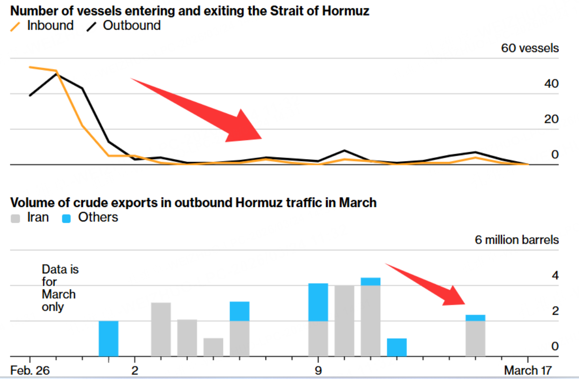 另一方面,占领岛屿的根本战略目的是为了彻底掐断伊朗的经济命脉——即阻止其出口石油。我们观察近期的数据可以发现一个有趣的现实是:自从海峡受阻以来,其他国家的石油运输通道几乎被完全封死,但伊朗自身的石油出口却仅有小幅下降。一旦美以联军收紧封锁,代价将是更多原本在市场流通的伊朗石油被限制出口,供给端的再收紧将给原油价格带来新一轮的上行压力。