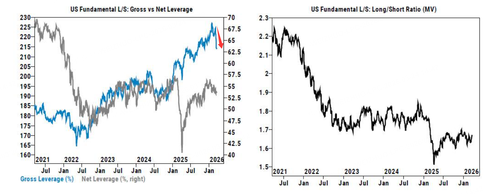 根据高盛主经纪业务的追踪,由于市场持续波动,基金经理纷纷降低风险。美国多空总杠杆率连续第二周暴跌,单周下降7.2个基点,降至一年来的第50%分位。