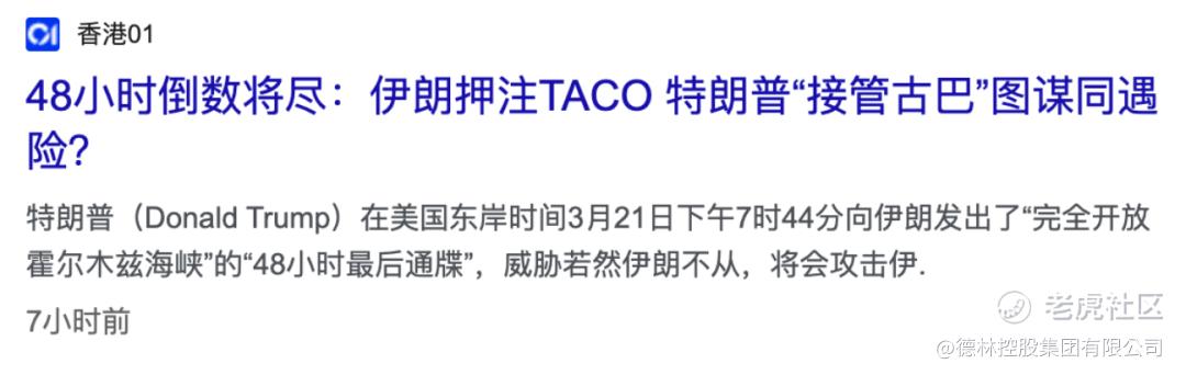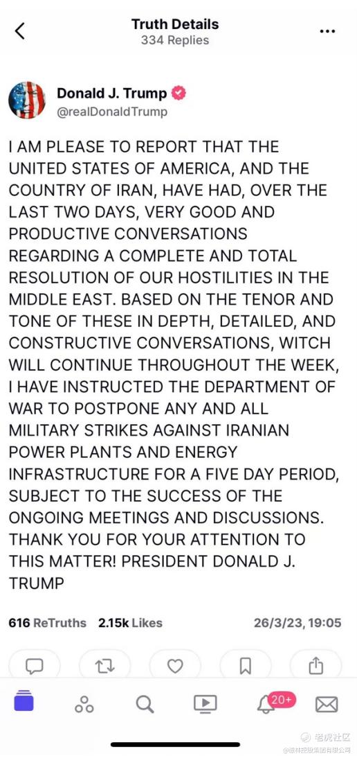 这话说出来还不到12个小时,3月23日晚上19:05分,特朗普就发文称推迟5天对伊朗发电厂及能源基础设施的所有军事打击,理由是在过去两天里和伊朗进行了深入和具有建设性的对话。