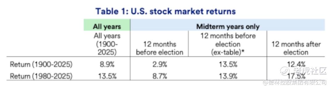 图3:标普500在中期选举前后12个月的收益率对比,来源:U.S. Bank