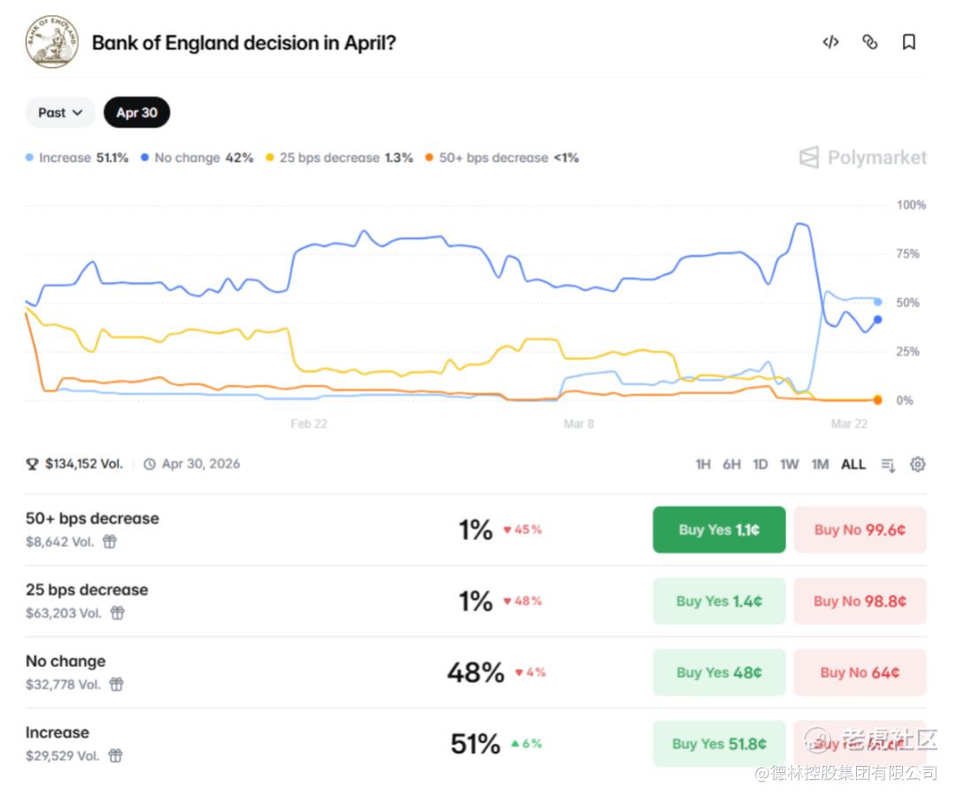 图1 Polymarket对英国央行4月份利息预测,来源:Polymarket