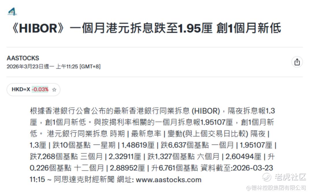 如果真的加息,这对所有资产类别都会带来连锁影响。目前股市下跌、债市下跌、黄金自战争以来更是跌了1000美元,美元指数却也保持相对平稳。那么资金到底流向哪里了呢?以我身处香港的视角,最明显的信号就是港币兑美元的走势。最近港币正快速向弱方兑换区间靠近,已升至约7.83,逼近7.75-7.85这个联系汇率制度区间的上限。原因非常简单:现在出现了明显的套息机会——1个月HIBOR已降至约1.95%,而美国1年期国债收益率在3.7%左右,这其中有一个接近2%的套利空间。