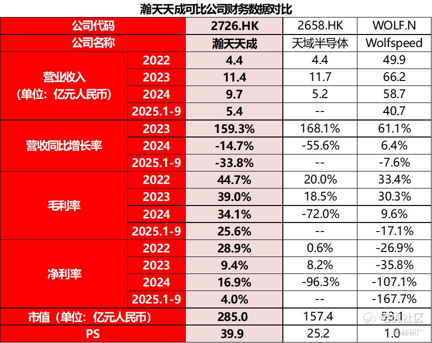 注:瀚天天成&WolfspeedPS=市值/(2025年前三季度营业收入*4/3);天域半导体PS=市值/(2025年前5个月营业收入*12/5);1港元=0.87812元人民币