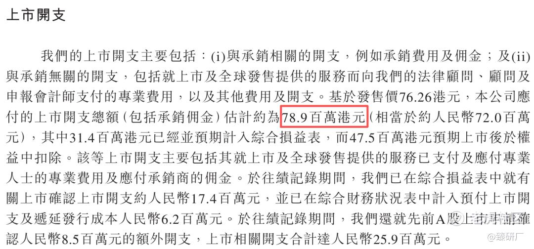 此次发行的开支总额估计约为7,890万港元,按发售价76.26港元计算,占募资总额的4.8%。