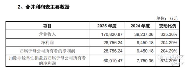 利润数据也很可观,2022年、2023年两年该公司还处在亏损状态,累计亏损超2600万;到2024年时就完美逆转,扣非后净利润达到7750.36万元,2025年该数值再度飙升至6亿,同比大涨674.29%。