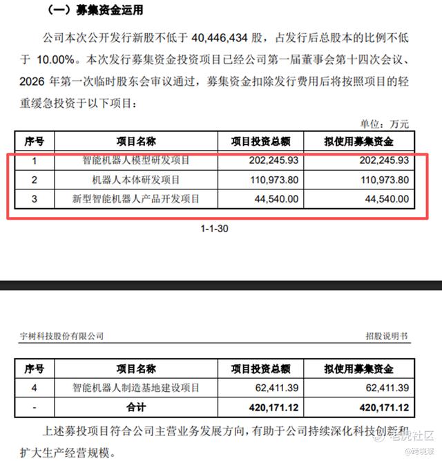 招股书披露,此次IPO宇树科技拟发行新股不低于4044.64万股,募资约42.02亿元,发行股本占比约10%。按募资额测算,初始发行该公司市值至少为420亿元。