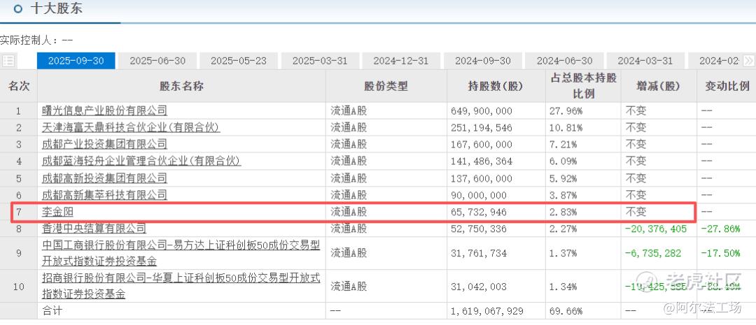 此外,李金阳还曾现身半导体巨头海光信息(688041.SH)的十大股东名单,截至2025年9月30日,其持股海光信息6573万股,占流通股比例2.83%。而截至2026年3月24日收盘,海光信息股价213.27元/股,总市值约4951亿元,李金阳持股比例对应流通市值超140亿元。