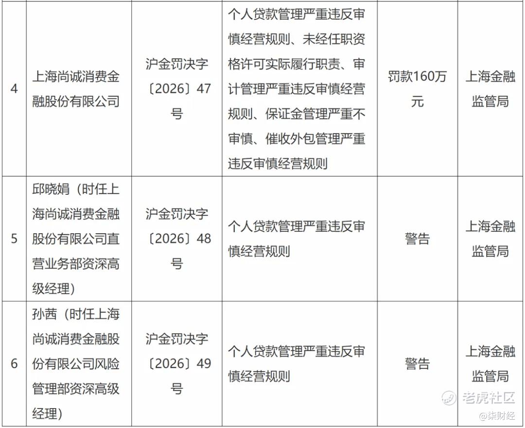 3月23日,国家金融监督管理总局上海局官网通报,尚诚消金因个人贷款管理严重违反审慎经营规则、未经任职资格许可实际履行职责、审计管理严重违反审慎经营规则、保证金管理严重不审慎、催收外包管理严重违反审慎经营规则等,被罚款160万元。
