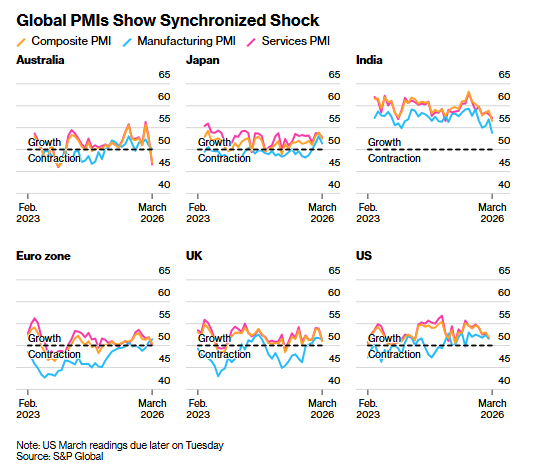 最新的商业调查显示,伊朗战事引发的外溢效应正重创经济增长动能并推高物价,全球经济初现同步震荡的迹象。
