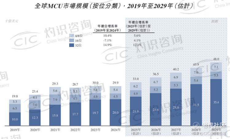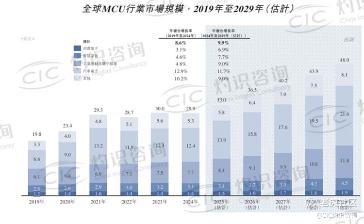 AI时代下,终端产品成为了世界重要的基础感知与执行层,因此各类终端不断向智能化、高端化和轻薄化的方向发展。MCU作为智能终端的核心控制器,兼具计算及安全功能,是构成智能时代的技术基础。根据CIC灼识咨询的资料,全球MCU市场规模预计将从2024年的299亿美元增长至2029年的480亿美元,年复合增长率9.9%。