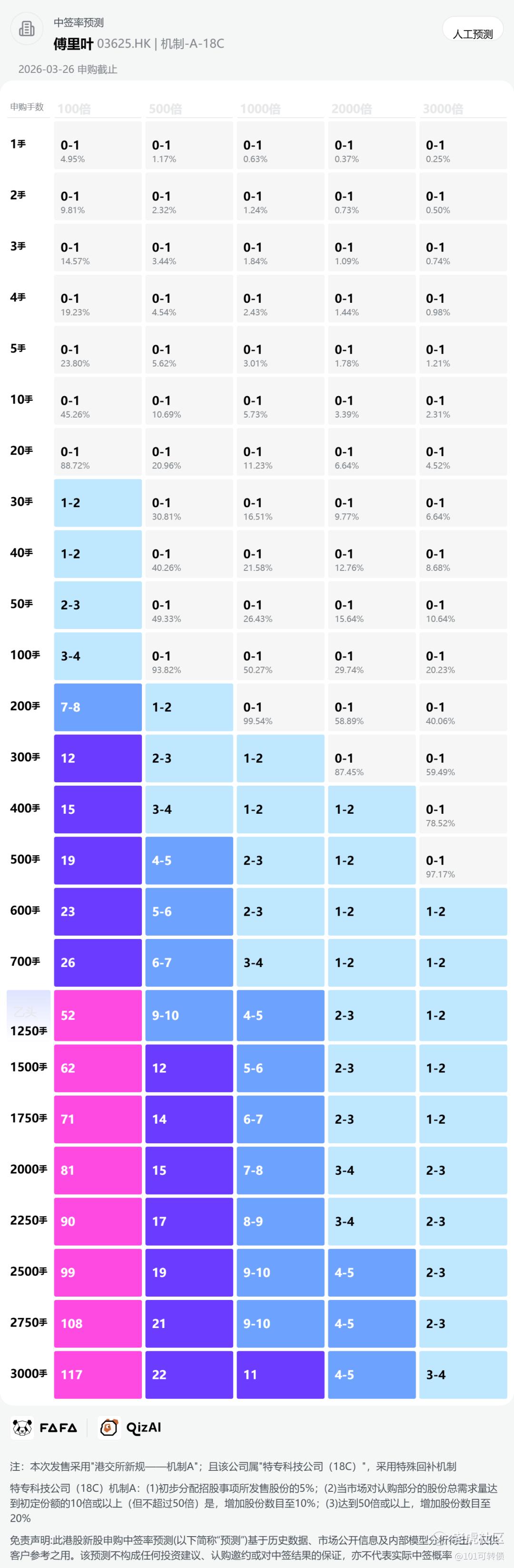 傅里叶采用机制A,最高回拨20%;全球发售1200万股,一手是100股;回拨5%:香港发售60万股,共计6000手;回拨10%:香港发售120万股,共计12000手;回拨20%:香港发售240万股,共计24000手;甲尾申购需要45万本金,乙头申购需要51万本金;华沿机器人、德适- B、同仁堂医养、翰天天成、极视角、铜师傅、傅里叶存在资金冲突,现在倍数是160倍了,预计最终会在1000倍左右;由国泰君安和东方融资联合保荐,无基石,有绿鞋,国泰君安历史保荐项目还可以,东方融资历史保荐项目一般。