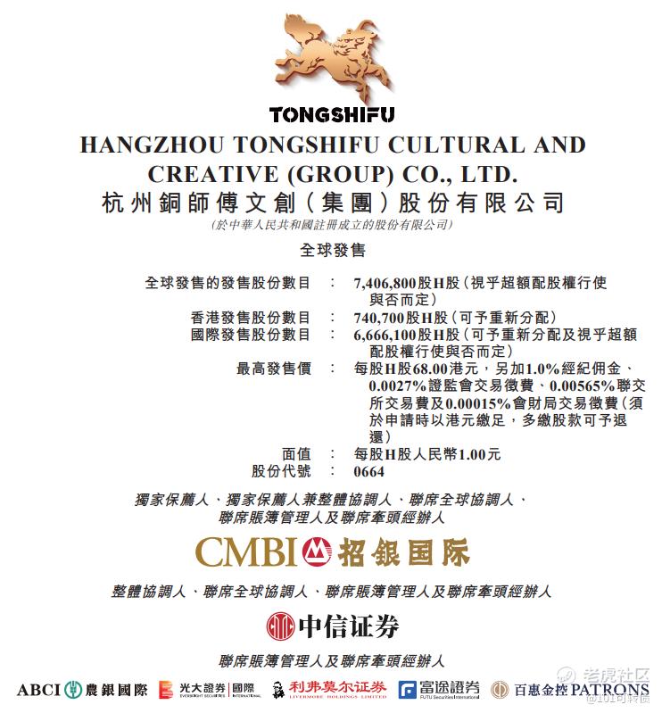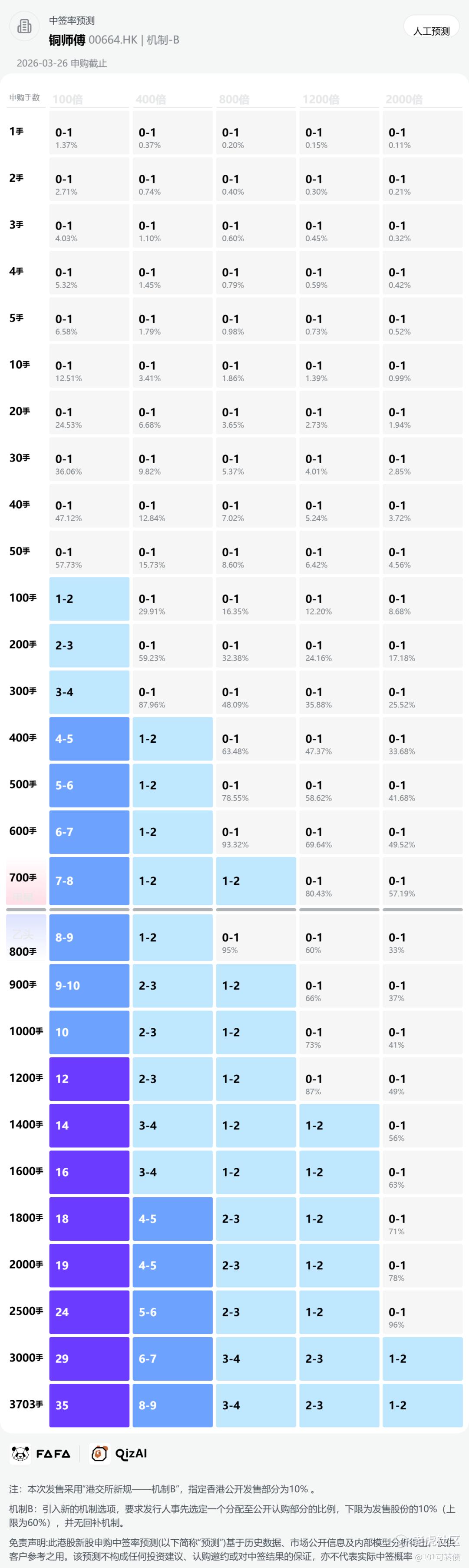 铜师傅采用机制B,回拨10%;全球发售740.68万股,香港发售74.07万股,一手是100股,共计7407手;甲尾申购需要48万本金,乙头申购需要55万本金;华沿机器人、德适- B、同仁堂医养、翰天天成、极视角、铜师傅、傅里叶存在资金冲突,现在倍数是20倍了,预计最终会在600倍左右;由招银独家保荐,有基石,有绿鞋,招银历史保荐项目还可以。