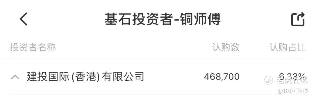 铜师傅此次引入1家基石投资者,认购6.33%份额;