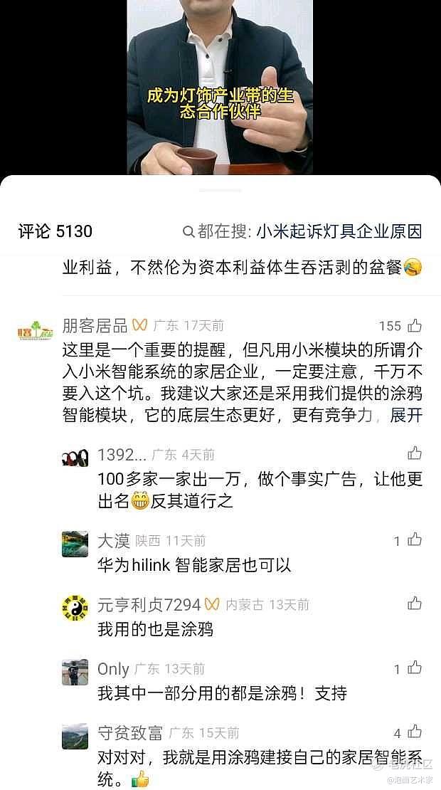 客观说,小米维护自有商标权益,规范品牌使用,这是企业的基本权利,完全能理解。但争议点也很明显:涉事企业都反映,小米没提前明确告知使用规范,也没给过整改机会,直接取证起诉;后续沟通也只能对接第三方外包律师,没机会和小米官方法务直接协商。这事儿也让不少做智能家居的厂商开始多手准备,评论区里就有人提涂鸦智能,说这种开放生态的方案,能给企业更多自主空间,不用过度依赖单一平台的规则。作为消费者来说,我觉得小米强管控品牌没问题,但也得平衡好规则透明和伙伴沟通。