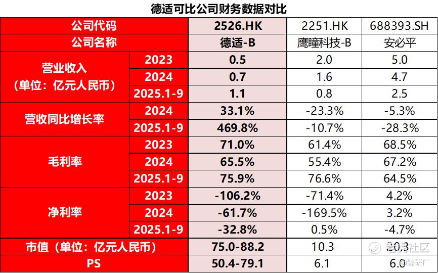 注:德适、安必平PS=市值/(2025年前三季度营业收入*4/3);表中所示为鹰瞳科技2025年上半年数据,其PS=市值/(2025年上半年营业收入*2);1港元=0.8825元人民币