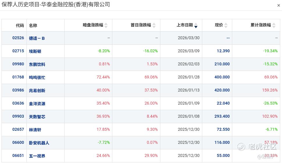 华泰历史上作为保荐人参与了74个项目,其中暗盘有41家公司上涨,30家公司下跌,3家公司平盘,破发率40.54%,首日破发率39.19%。2026年以来参与保荐的6个项目中首日及暗盘仅1家破发,表现不错。