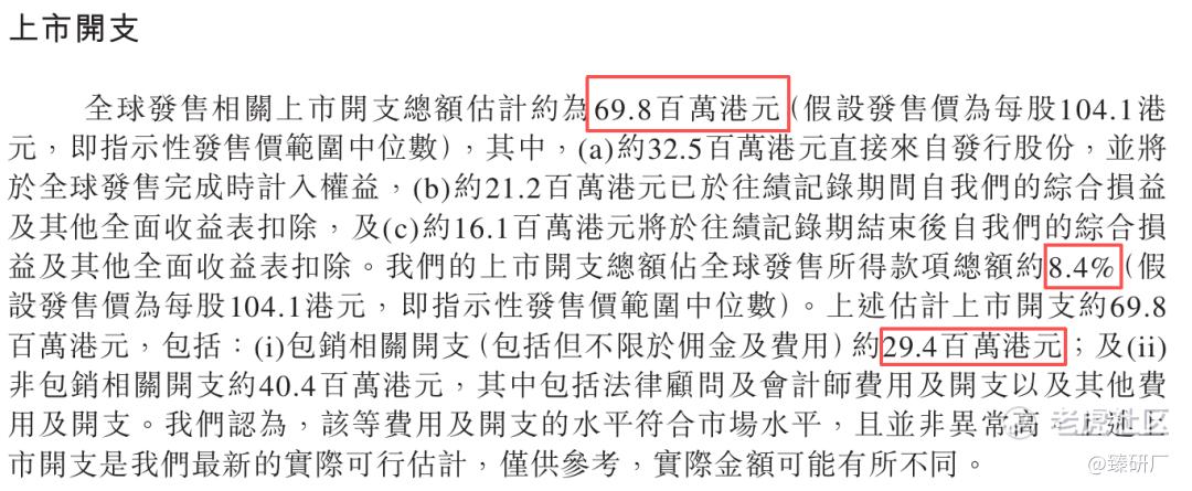 此次发行的开支总额估计约为6,980万港元,按发售价104.1港元计算,占募资总额的8.4%,其中包销开支2,940万港元,占募资总额的3.5%。