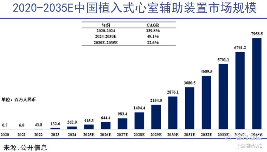人工心脏的出现,为这些患者带来了生的希望,也给企业带来巨大的市场想象空间。根据弗若斯特沙利文的测算,2021年中国心室辅助装置市场规模为600万元,2024年已增长至 2.6亿元,至2035年预计将增长至79.6亿元。
