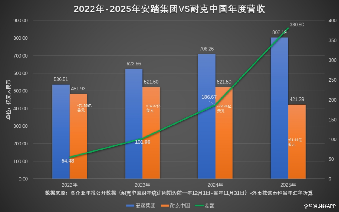 3月25日,安踏体育发布2025年业绩公告。财报显示,集团2025年实现营收802.19亿元(人民币,下同),同比增长13.3%。2025年营收与2024年相比,相当于一年增长出一个百亿级体量的公司。