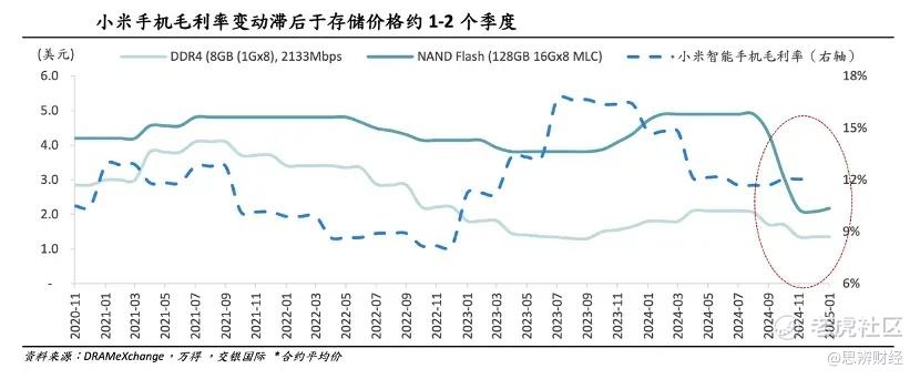 交银国际对小米的跟踪研究发现,手机业务毛利率变动滞后于存储价格1-2个季度,2025年初存储价格开始加速上涨,小米手机下半年毛利率便加速下行,2025年末,随着龙虾(Open Claw)的爆火,又将存储价格推到了新的高点。