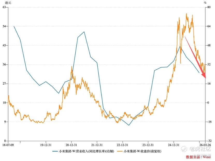 如上图所示,小米自上市以来,其市值走势便与其营收增速保持着密切关系,换句话说营收增速基本可视为小米估值的“锚点”。2025年小米营收同比增长25%达到4573亿元,其中2025年Q4同比增速只有7.3%(总营收规模为1169亿元),也就是说2025年小米营收增速是呈“前高后低”的加速下滑态势的。
