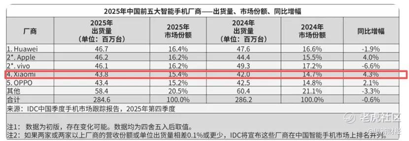 2025年小米手机营收同比减少2.8%,ASP(单部手机售价)从上年的1138.2元降到1128.7元,Q4其营收降速高达13.6%,而ASP则由上年同期的1202元降到1176元。
