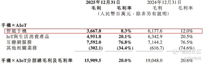 2025年Q4,小米手机毛利率由上年同期的12%降到8.4%,可谓是近几年非常低的数字了,与2021年”输入性通胀“最严峻的时刻不相上下。