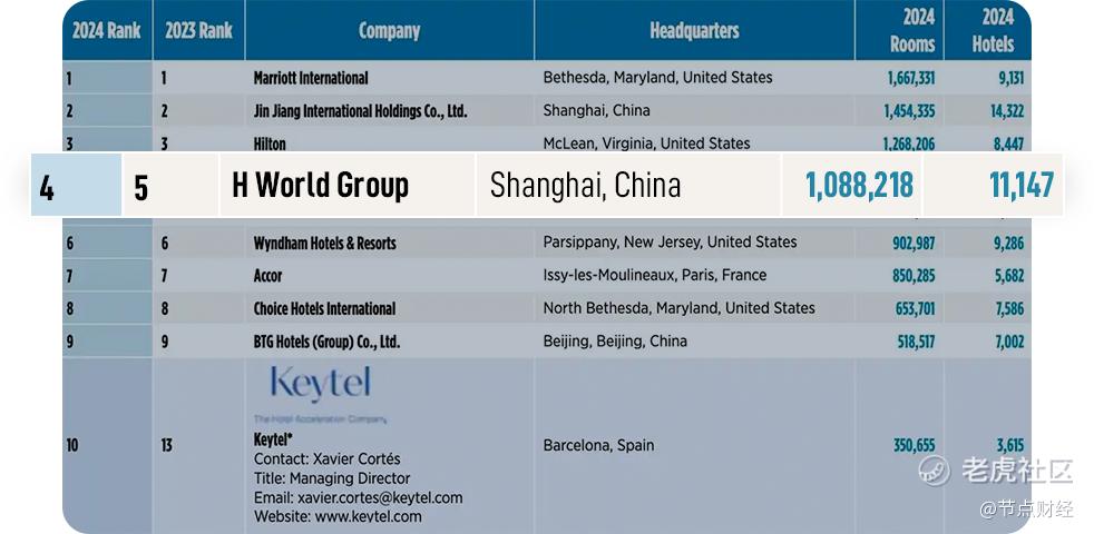 图注:华住集团位列《HOTELS》杂志“2024全球酒店集团205强”榜单第四