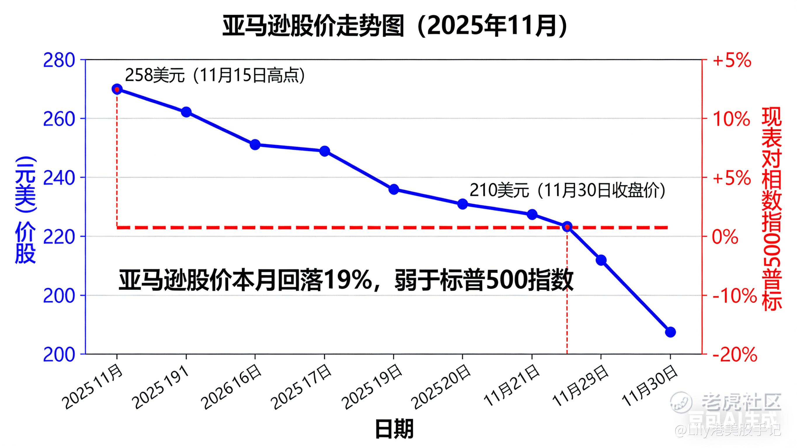 截至目前, $亚马逊(AMZN)$ 股价较 2025 年 11 月 258 美元的历史高点,累计回落幅度已达 19%,过去一年股价走势全面跑输标普 500 指数,全年收益近乎持平,市场彻底失去对这家科技巨头的信心。