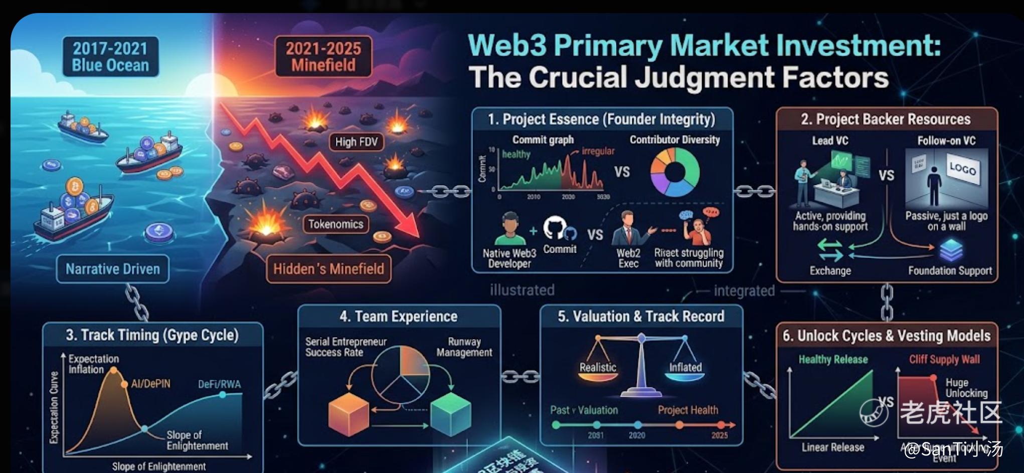 总结来说,2026年的Web3一级市场早已彻底告别了“闭眼盲投、狂吃叙事红利”的草莽时代。当下的市场环境更像是一面无情的“照妖镜”:极高的FDV、复杂的Cliff解锁困境以及隐秘的老鼠仓,让投资逻辑从单纯的“看赛道、看机构”,转变成了深度的“人性和经济模型博弈”。在这个地狱级难度的周期里,大牌机构的Logo不再是免死金牌,叙事的热度也往往暗藏杀机。对于投资者而言,唯有回归常识——严审创始团队的道德底线、拆解代币释放的供需生死局、穿透链上数据的真伪,才能在遍地雷区中过滤出真正的价值标的。没有最完美的模型,只有对市场敬畏且负责任的建设者。