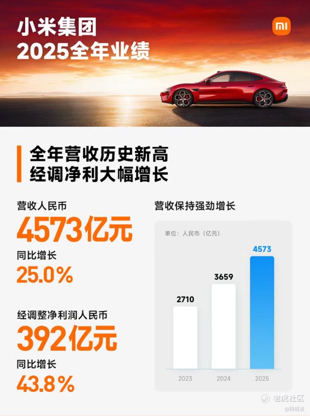 财报数据显示,2025年全年,小米集团实现总营收4573亿元,同比增长25%;经调整净利润达392亿元,同比大涨43.8%,双双创下历史新高。