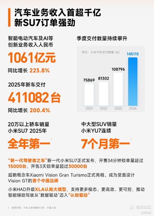 数据显示,2025年全年小米新车交付量超41万台,同比增长200.4%,大爆款小米SU7更是直接拿下2025年国内20万以上轿车销量冠军,狠狠扬眉吐气。