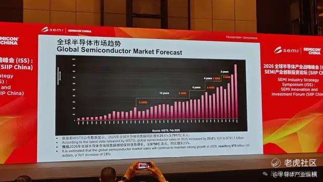 今天,SEMI中国总裁冯莉在2026全球半导体产业战略峰会(ISS):SEMI产业创新投资论坛 (SIIP China)上系统阐释了全球半导体产业正在经历的加速增长与结构性变革。她指出,在人工智能与数字经济的双重驱动下,原定2030年实现的万亿美元市场规模目标,有望提前至2026年底达成。