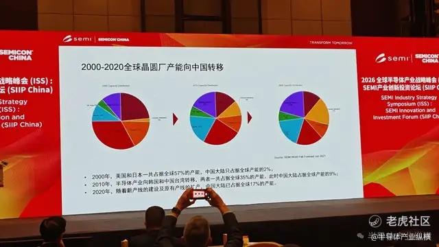 在产能方面,冯莉晒出了一组直观的数据:全球晶圆厂产能已向中国转移。过去二十年,中国大陆晶圆制造产能占全球比重实现三级跳:2000-2020年全球晶圆厂产能向中国转移,2000年中国晶圆产能占比仅为2%,2010年提升至9%,2020年达到17%。