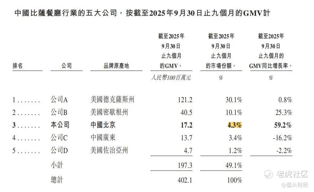 据招股书及灼识咨询数据,截至2025年9月30日,中国自助餐厅行业五大公司的市场份额仅为4.4%,市场集中度极低,竞争异常分散。即便比格按GMV计在中国自助餐厅行业排名第一,但市场份额仅为1.2%。