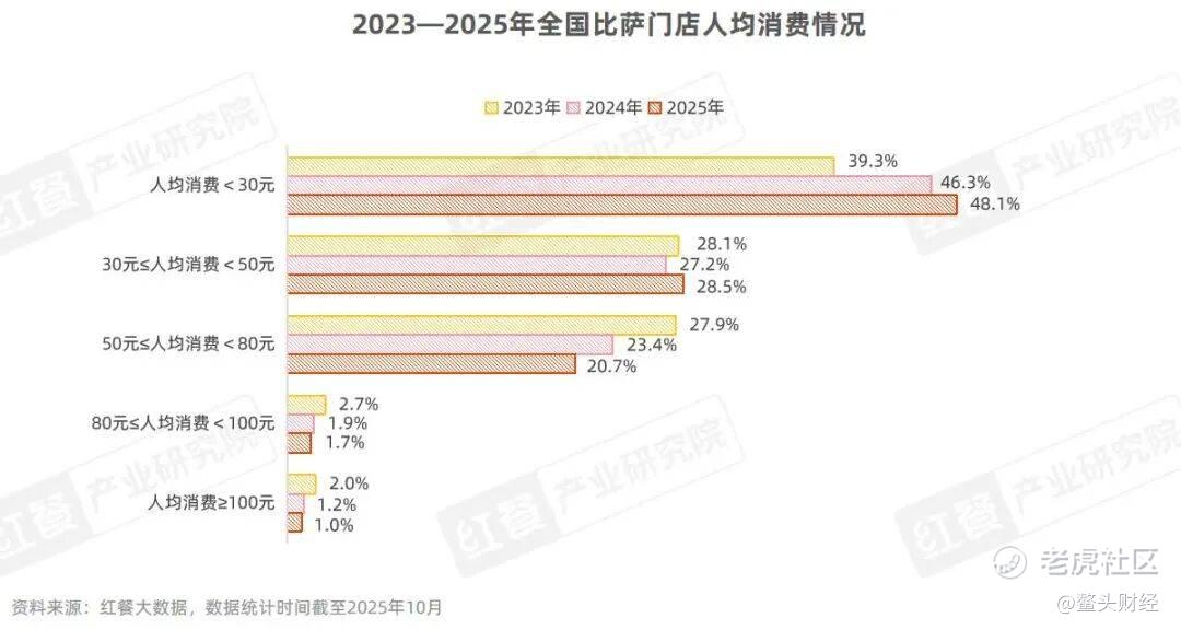 同时,比萨品类人均消费呈下滑态势。截至2025年10月,人均消费在30元以下的比萨门店占比达48.1%,居于首位;人均消费在50元—80元区间的门店数占比逐年降低至20.7%。