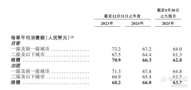 招股书显示,2023年至2025年前三季度,比格自营店每单平均消费额从70.9元降至62.8元,降幅达11.42%;加盟店从68.2元降至63.7元,降幅也有6.6%。