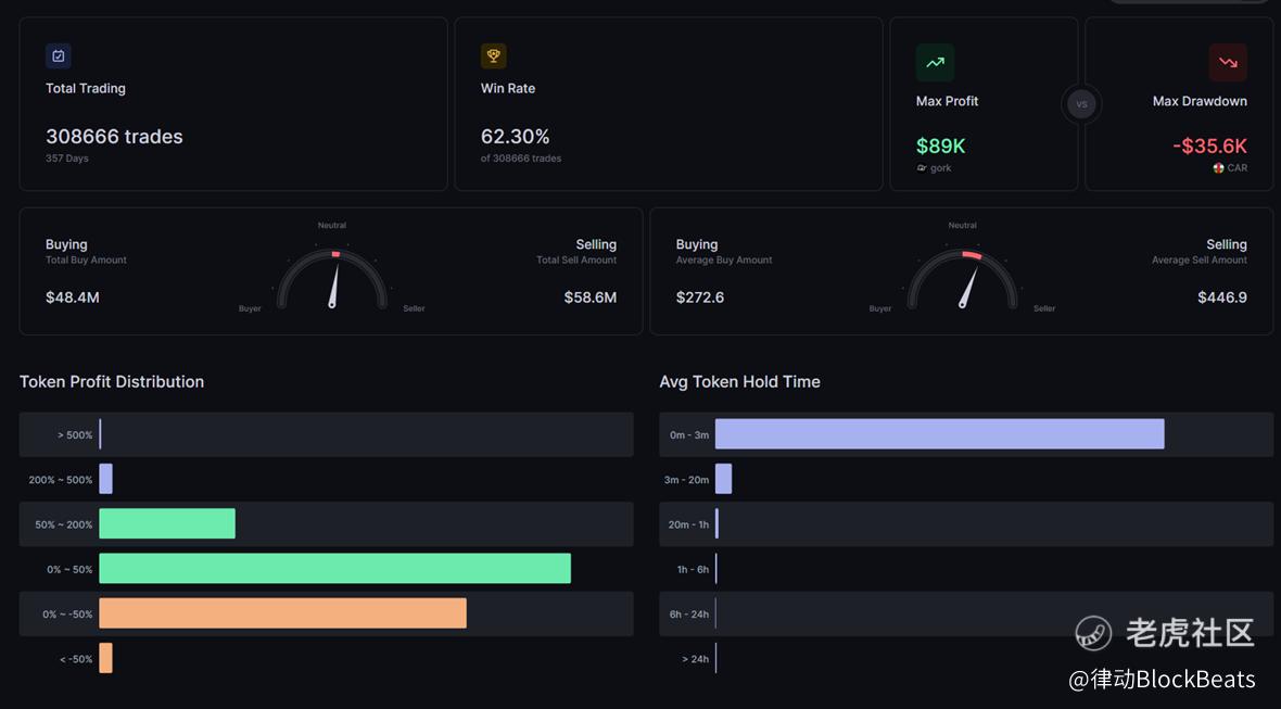 这种堪称「印钞机」的盈利能力,对应的 357 天内总计 308666 笔交易,胜率为 62.3%,以及仅仅 7 秒的持仓时间中位值。