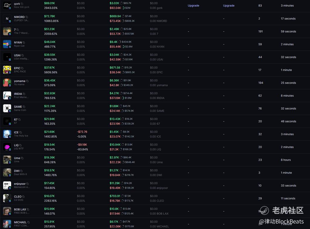 他的千万美元盈利,没有一笔是来自钻石手的「大结果」,最大的单笔盈利来自 $gork,也仅仅斩获了约 9 万美元利润。而在下面的盈利币种排名中,他赚的很多钱,炒的都是我们可能听都没听说过的币。