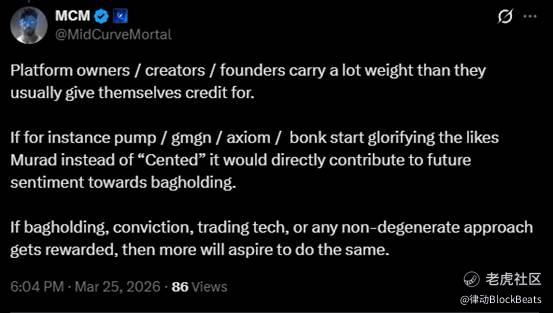 「如果 pump.fun、gmgn、axiom、bonk.fun 等平台开始推崇 Murad 这样的 KOL 而不是 Cented 之流,大家对交易的态度就会发生改变。长持、信念等交易方式得到回报,就会有更多的人效仿这种古典的技术」