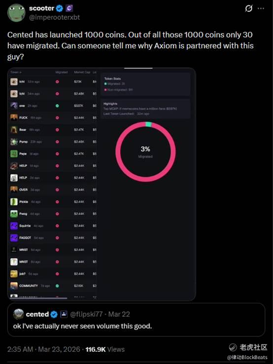 此外,Cented 发过 1000 个币,只有 30 个币成功毕业。