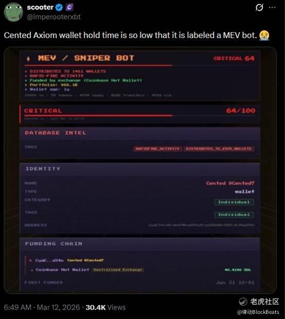 由于持仓时间太短、交易频率太高,Cented 的地址甚至被标记为 MEV 机器人。