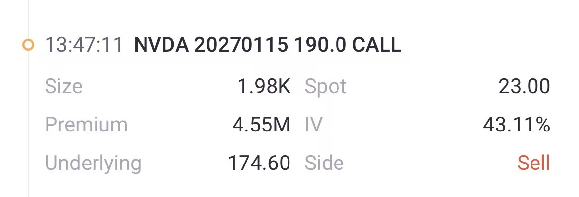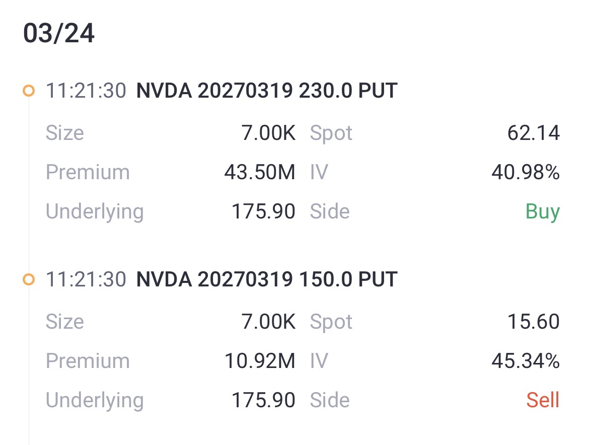 熊市看跌价差押注:有机构卖出了7,000张2027年3月到期、行权价150美元的深度虚值Put,同时买入了同样到期日的、行权价为230美元的Put。该策略的盈亏平衡点为185美元,当英伟达股价在到期日前低于185美元时,该策略将能够盈利。
